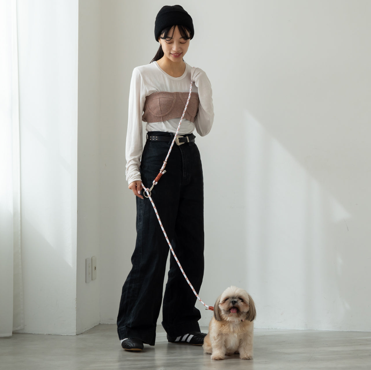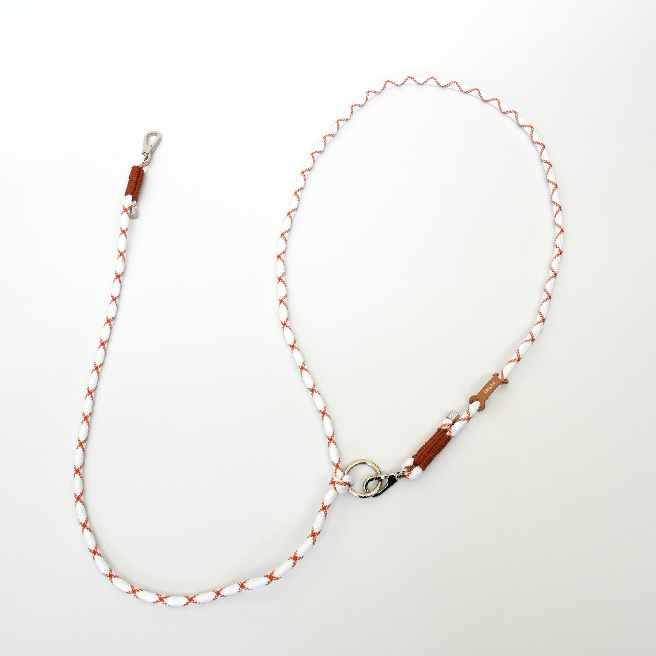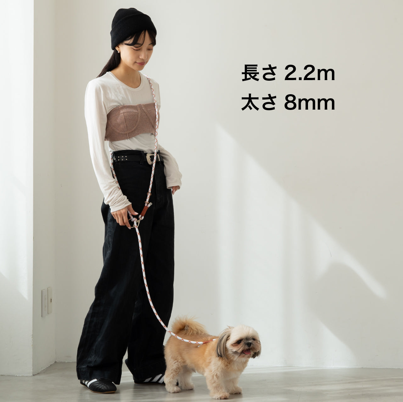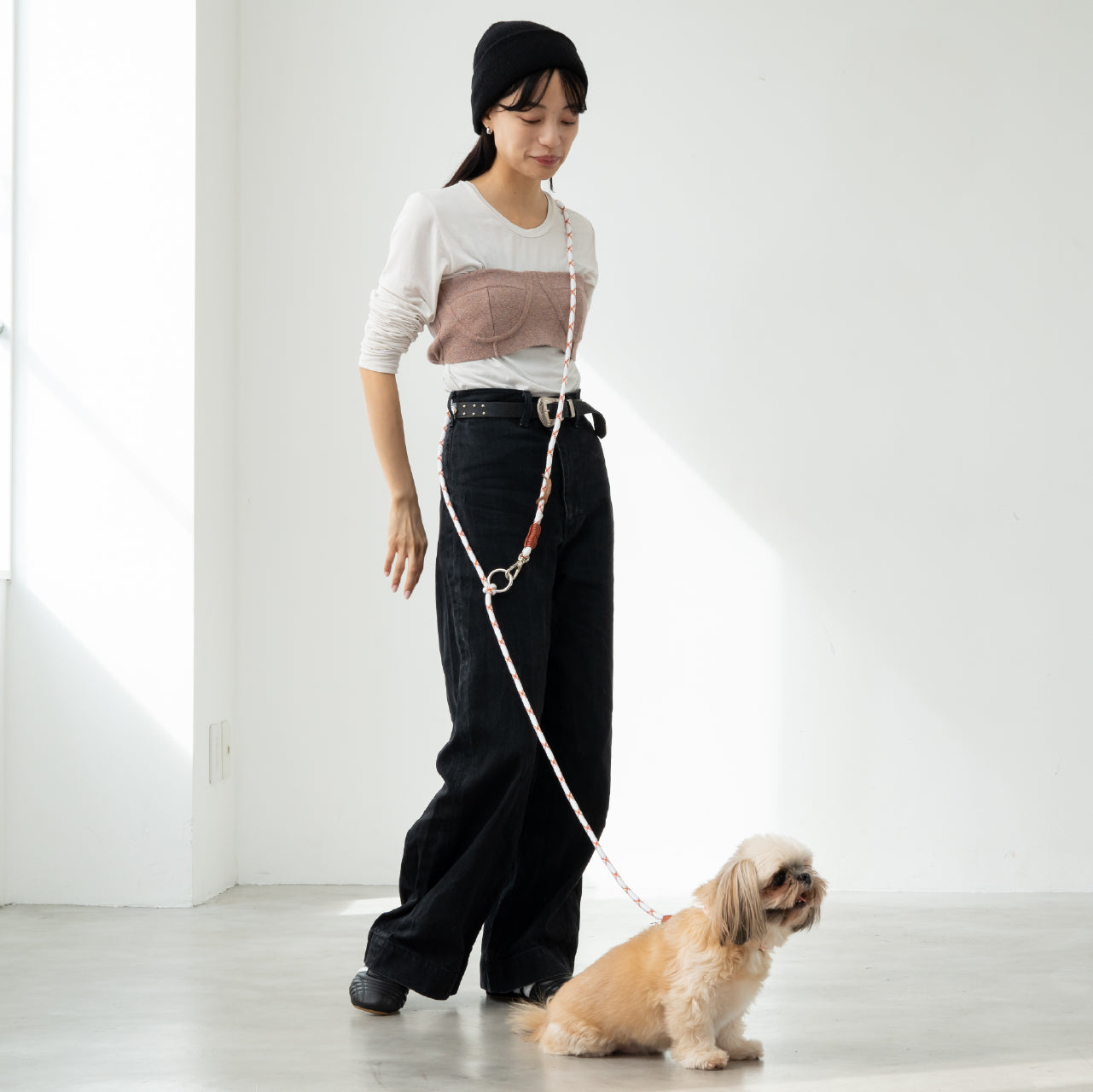 発色の良いナイロン製のロープで出来たリード。ロープからオリジナルで製作しており、オーナー様のコーディネートの差し色になるようなに配色を考えています。男女問わず、持っていただけるデザインです。