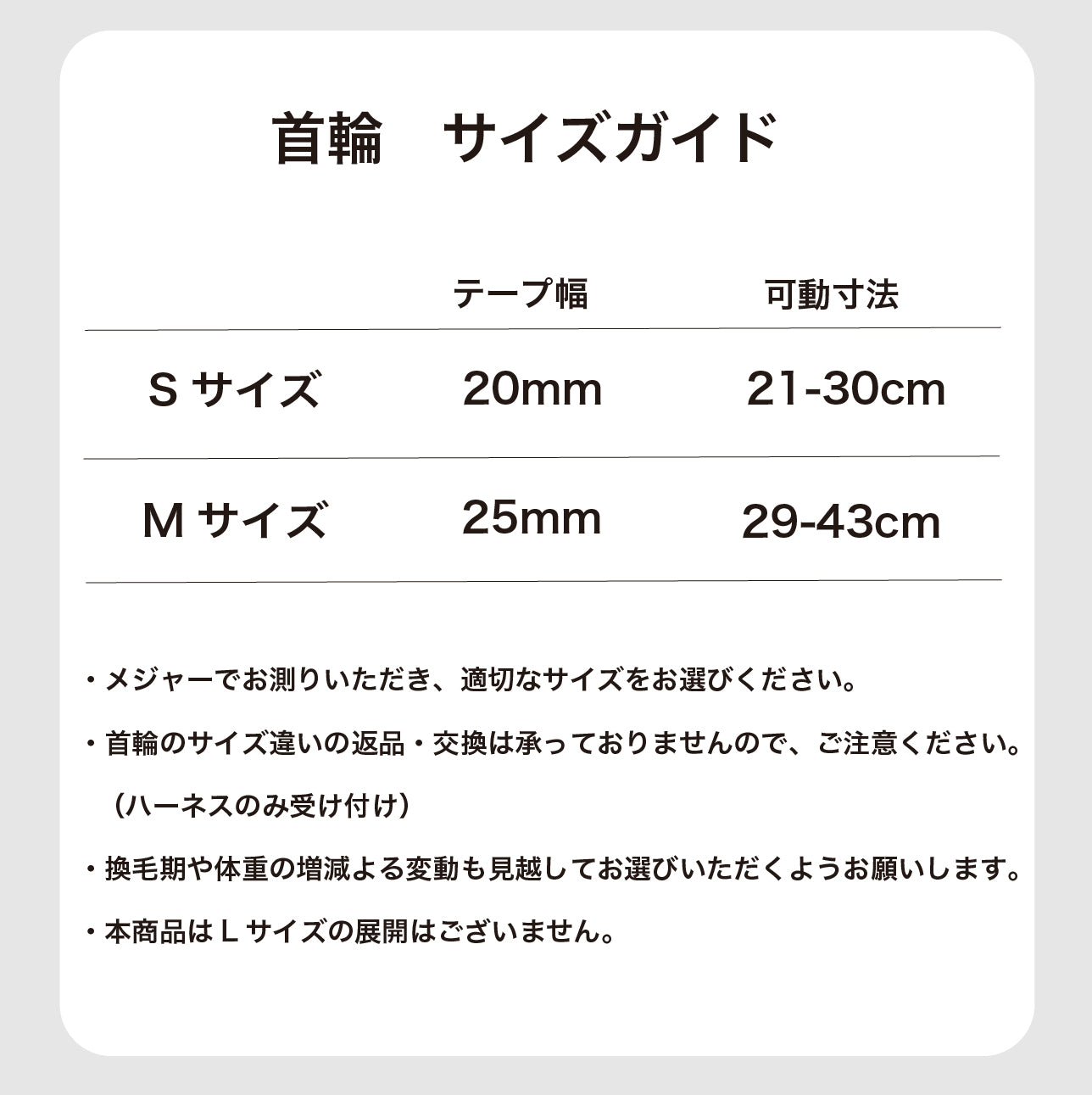 | Mサイズ | 25mm | 29-43cm | 7kg~18kg |