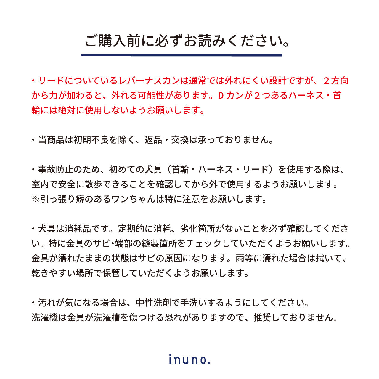 ・事故防止のため、初めての犬具(首輪・ハーネス・リード)を使用する際は、 室内で安全に散歩できることを確認してから外で使用するようお願いします。