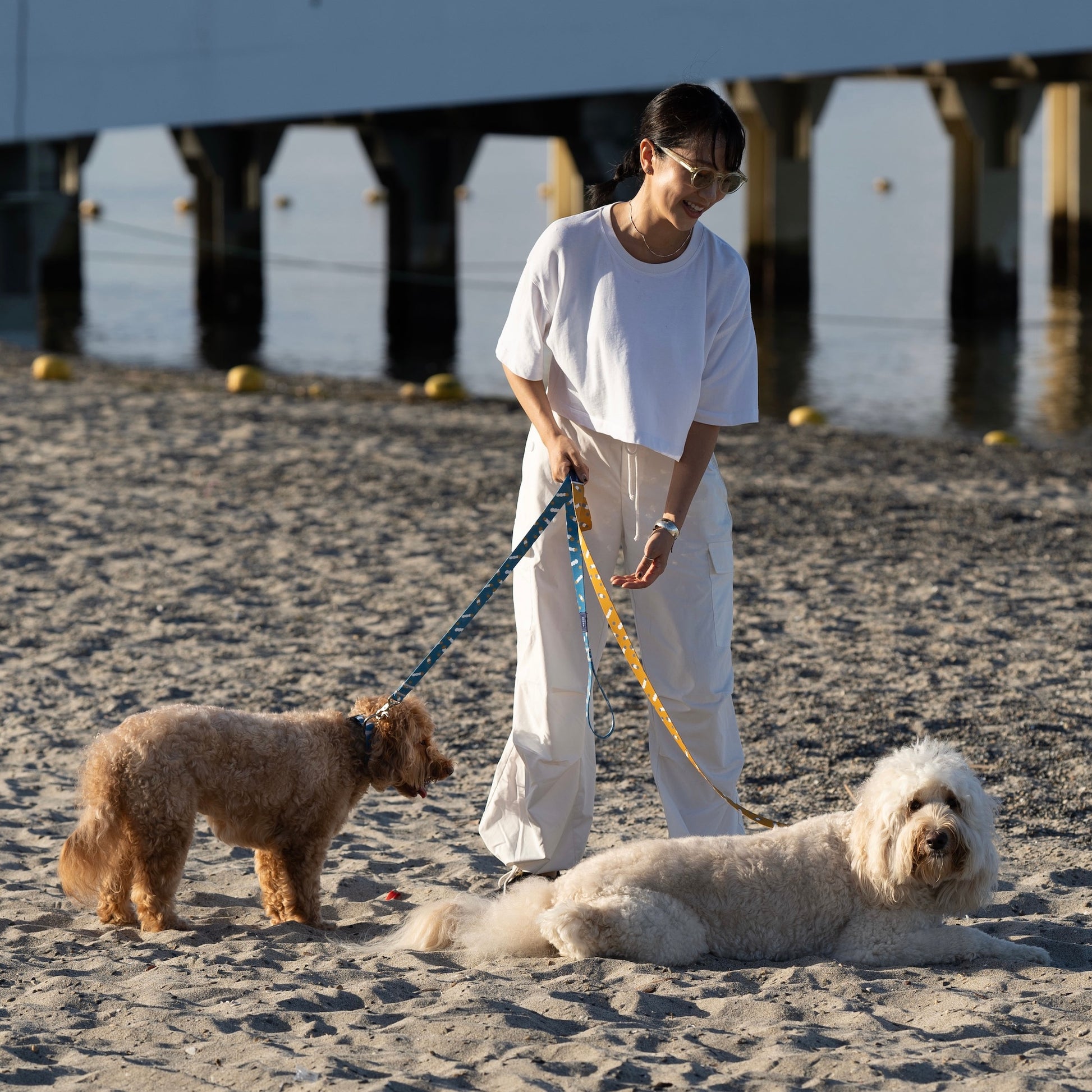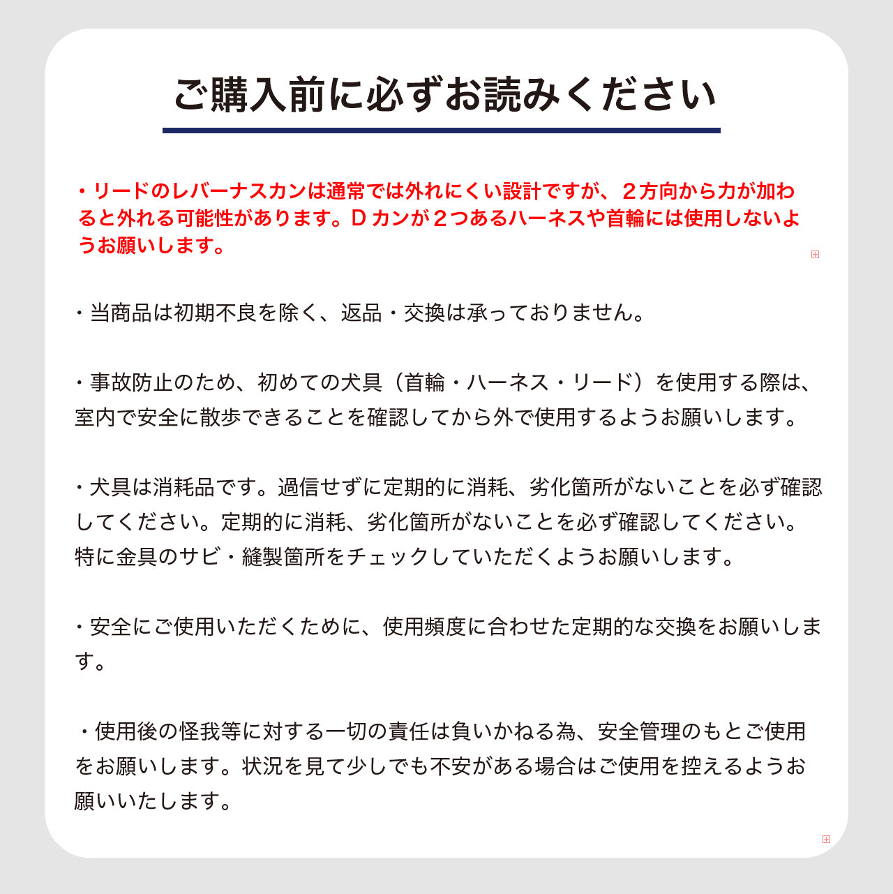 ・事故防止のため、初めての犬具(首輪・ハーネス・リード)を使用する際は、 室内で安全に散歩できることを確認してから外で使用するようお願いします。