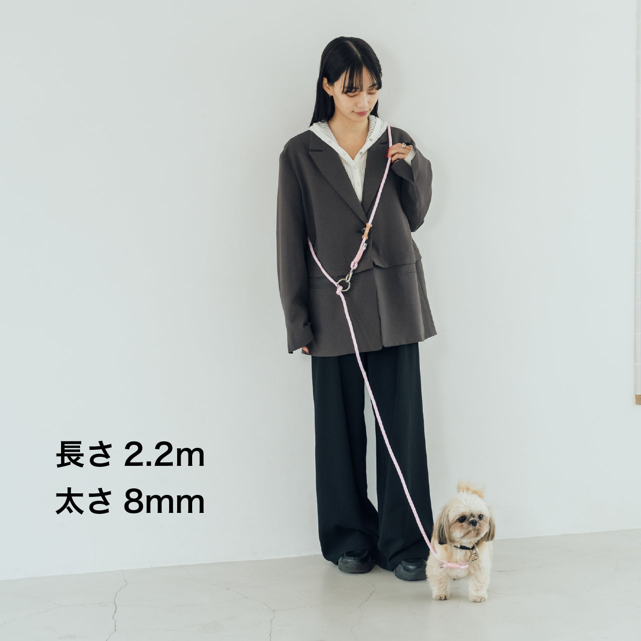 発色の良いナイロン製のロープで出来たリード。ロープからオリジナルで製作しており、オーナー様のコーディネートの差し色になるようなに配色を考えています。男女問わず、持っていただけるデザインです。